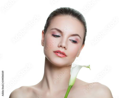 Young healthy woman portrait. Female face with white flower isolated on white background