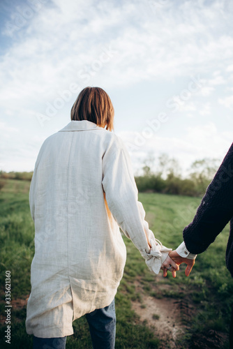 Young hipster couple in love with walking near forest. Have fun on vacation running around on the grass at sunset