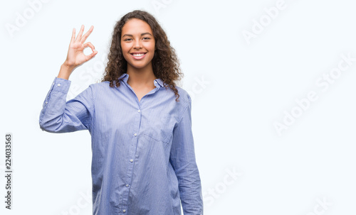 Young hispanic business woman smiling positive doing ok sign with hand and fingers. Successful expression.