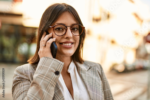 Young hispanic businesswoman smiling happy talking by the smartphone at the city.