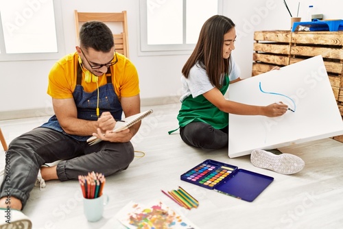 Young hispanic couple smiling happy drawing sitting on the floor at art studio.