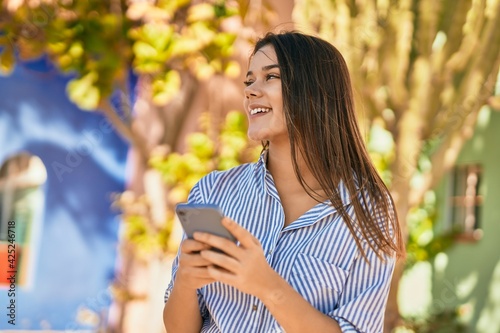 background, beautiful, beauty, brunette, casual attire, cheerful, city, communication, confident, conversation, cool, device, enjoy, expression, face, fun, contraption, girl, happy, healthy, hispanic, joy, lifestyle, message, mobile, modern, natural, outdoors, person, phone, portrait, positive, smartphone, smile, smiling, standing, street, style, sunlight, technology, teenage, phone, texting, town, urban, using, walk, walking, woman, young