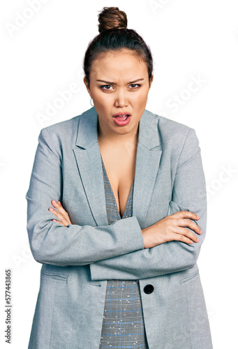 Young hispanic girl wearing business clothes in shock face, looking skeptical and sarcastic, surprised with open mouth