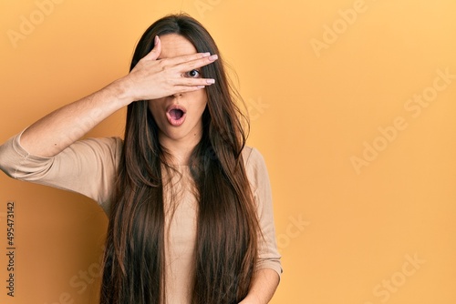 Young hispanic girl wearing casual clothes peeking in shock covering face and eyes with hand, looking through fingers afraid