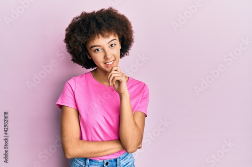 arm, camera, casual attire, chin, clothes, confident, crossed, girl, hand, hispanic, looking, positive, smiling, thinking, young, adult, afro, arm, attractive, cheerful, cool, face, fashion, fashionable, female, front, great, happiness, happy, idea, people, person, pink, portrait, posing, proud, serious, smile, standing, studio, style, stylish, success, view, woman, wonder