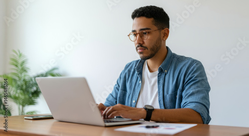 young, hispanic, male, laptop, desk, computer, work, casual attire, indoor, condensed, goggles, denim, shirt, technology, typing, home, office, sharpened, beard, plant, smartphone, watch, table, paper, note, interior, workspace, occupation, professional, modern, concentrated, setup, remote, freelancer, business, digital, device, thoughtful, man, tech, online, cyberspace, workplace, serious, adult, study
