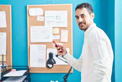 young, hispanic, man, male, guy, adult, person, portrait, photogenic, beard, happy, confident, smile, lifestyle, expression, smiling, enjoy, business, professional, work, men at work, working, success, manager, boss, employee, elegant, job, standing, smartphone, mobile phone, phone, texting, message, typing, cyberspace, online, device, contraption, office, workplace, indoor, indoor, interior, room, background