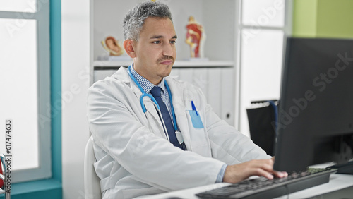 young, hispanic, man, male, guy, adult, person, portrait, photogenic, grey hair, health care, medicals, medicine, work, working, professional, stethoscope, uniform, table, desk, surgeon, diagnosis, visit, consultation, sitting, cyberspace, online, computer, device, technology, attaching, serious, relaxed, condensed, clinic, center, hospital, room, workplace, indoor, indoor, interior, background