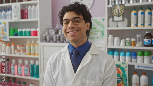 Young hispanic man in a pharmacy wearing a lab coat and glasses, standing in front of well-organized shelves with various pharmaceutical products.
