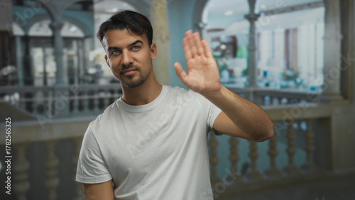Young hispanic man in a white shirt waves indoors at a hotel featuring elegant architecture and soft lighting creating a welcoming and relaxed atmosphere.