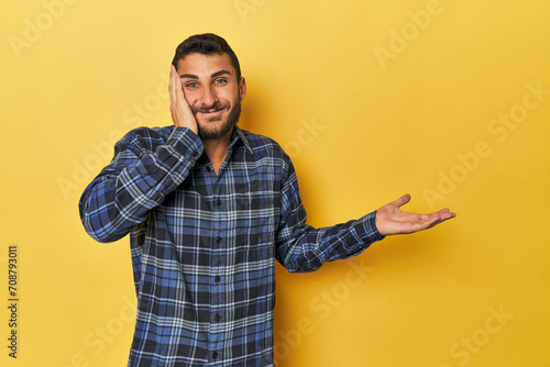 Young Hispanic man on yellow background holds copy space on a palm, keep hand over cheek. Amazed and delighted.