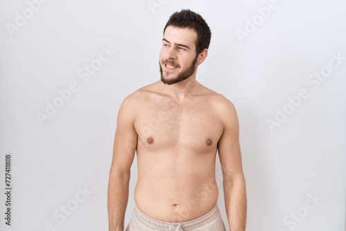 Young hispanic man standing shirtless over white background looking away to side with smile on face, natural expression. laughing confident.