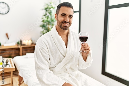 Young hispanic man wearing bathrobe toasting with wine at beauty center