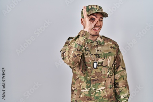 Young hispanic man wearing camouflage army uniform doing ok gesture with hand smiling, eye looking through fingers with happy face.