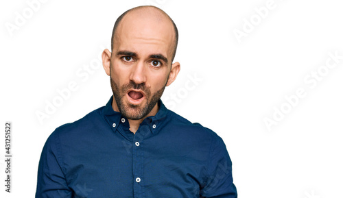 Young hispanic man wearing casual clothes in shock face, looking skeptical and sarcastic, surprised with open mouth