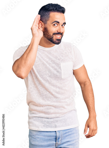 Young hispanic man wearing casual clothes smiling with hand over ear listening an hearing to rumor or gossip. deafness concept.