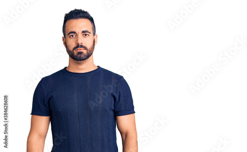 Young hispanic man wearing casual clothes with serious expression on face. simple and natural looking at the camera.