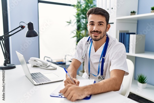 Young hispanic man wearing doctor uniform writing on document working at clinic