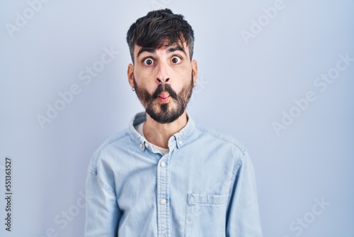 Young hispanic man with beard standing over blue background making fish face with lips, crazy and comical gesture. funny expression.