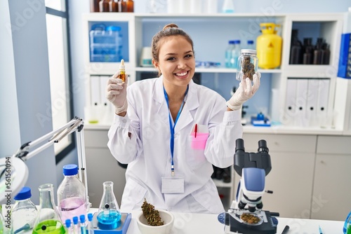 Young hispanic woman doing weed oil extraction at laboratory smiling with a happy and cool smile on face. showing teeth.