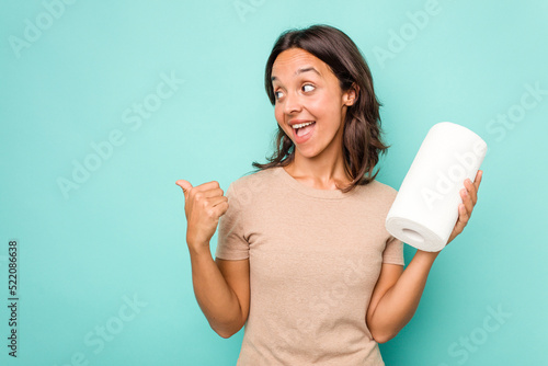 Young hispanic woman holding kitchen roll isolated on blue background points with thumb finger away, laughing and carefree.