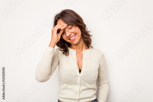 Young hispanic woman isolated on white background joyful laughing a lot. Happiness concept.