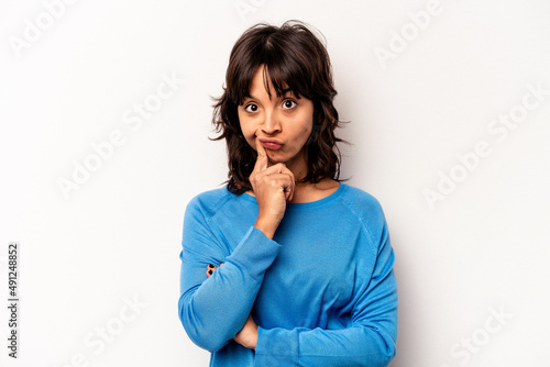 Young hispanic woman isolated on white background unhappy looking in camera with sarcastic expression.