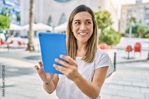 young, hispanic, woman, female, beautiful, adult, person, portrait, attractive, happy, happiness, confident, cheerful, confidence, looking, cool, smile, lifestyle, expression, positive, smiling, enjoy, fun, standing, racked, walk, walking, using, technology, device, contraption, cyberspace, online, touchpad, tablet, laptop, computer, touch, screen, street, city, urban, town, outdoors, exterior, background