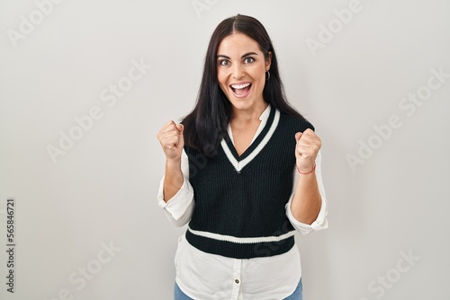 arm, background, celebrate, hispanic, isolated, over, raised, standing, success, winner, woman, young, achievement, adult, brunette, casual attire, celebration, cheer, cheerful, excited, expression, face, female, fun, funny, gesture, girl, happiness, happy, indoor, joy, joyful, latin, lifestyle, portrait, positive, scream, smile, smiling, successful, triumph, victory, succeed, winning, yes
