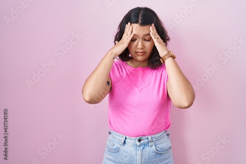 Young hispanic woman standing over pink background with hand on head, headache because stress. suffering migraine.