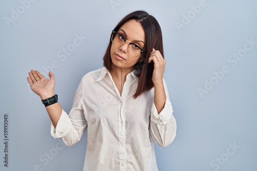 Young hispanic woman standing over white background confused and annoyed with open palm showing copy space and pointing finger to forehead. think about it.