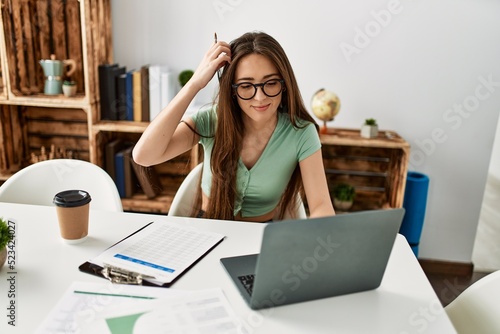 Young hispanic woman using laptop drinking coffee sitting on table at home