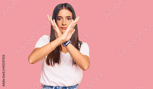 Young hispanic woman wearing casual white tshirt rejection expression crossing arms doing negative sign, angry face