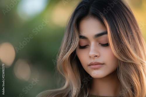 woman, hispanic, young, portrait, nature, beauty, make-up, coiffure, peace, calm, contemplation, grass, sunlight, bokeh, sharpened, soft, expression, eyelash, eyebrow, lip, nose, eye, face, model, fashion, feminine, elegance, style, glow, warmth, gentle, green, background, quiet, summer, autumn, spring, landscape, relaxed, thoughtful, isolated, alone, dreamy, harmonious, mindfulness