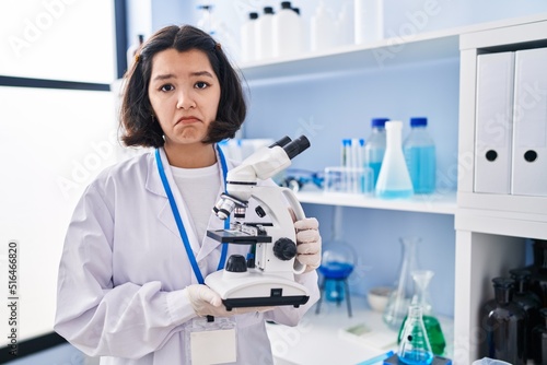 Young hispanic woman working at scientist laboratory holding microscope depressed and worry for distress, crying angry and afraid. sad expression.