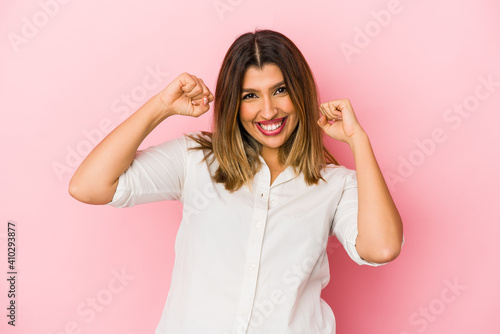 Young indian woman isolated on pink background celebrating a special day, jumps and raise arms with energy.