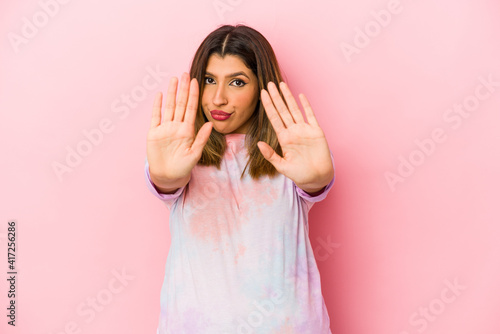 Young indian woman isolated on pink background standing with outstretched hand showing stop sign, preventing you.