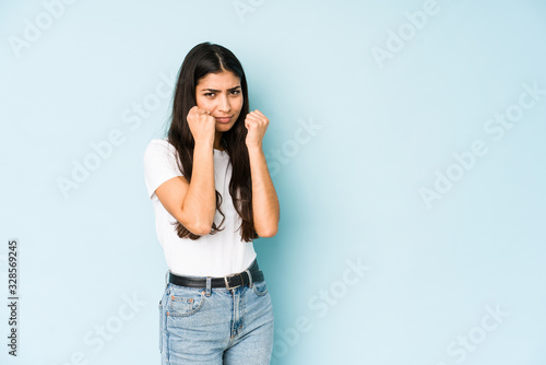Young indian woman on blue background throwing a punch, anger, fighting due to an argument, boxing.