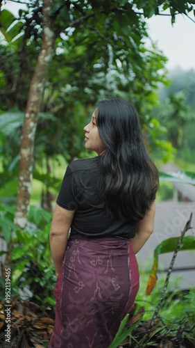 indonesian, woman, traditional, clothing, batik, sarong, tropical, forest, long, hair, young, female, nature, background, cultural, heritage, ethnic, fashion, portrait, serene, atmosphere, bali, style, textile, art, summer, vibe, asian, beauty, back, view, looking, away, lush, greenery, daylight, scene, casual attire, wear, identity, indonesia, travel, authentic, soft, lighting, natural, woven