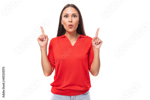 copy space, pointing, cheerful, white, woman, brunette, beautiful, young, portrait, smile, attractive, showing, happy, person, background, fun, caucasian, joy, hair, casual attire, expression, advertisement, business, gesture, female, confident, displaying, lifestyle, stylish, positive, lady, 30s, adult, red, shirt, blouse, t-shirt, white background, copy space, well-groomed, authentic, cute, carefree, demonstrate, show, idea, suggest