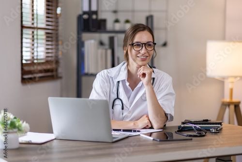 Young lady doctor in white medical uniform using laptop talking video conference call with senior doctor at desk,Doctor sitting at desk and writing a prescription for her patient