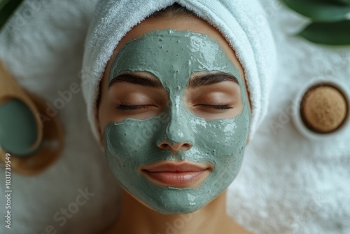 Young lady enjoying beauty treatments in spa salon, getting nourishing clay mask on face, above view shot, Generative AI