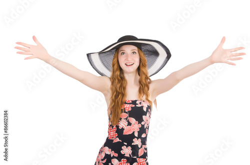 dress, elegant, fashionable, attractive, girl, lady, woman, clothing, beautiful, posing, caucasian, hair, pretty, young, closeup, closeup, portrait, sewing, fashion, glamourous, glamourous, studio, red, redhead, smiling, cheerful, happy, glad, joyful, floral, black, hat, sombrero, summer, flower, frock, background, white, isolated