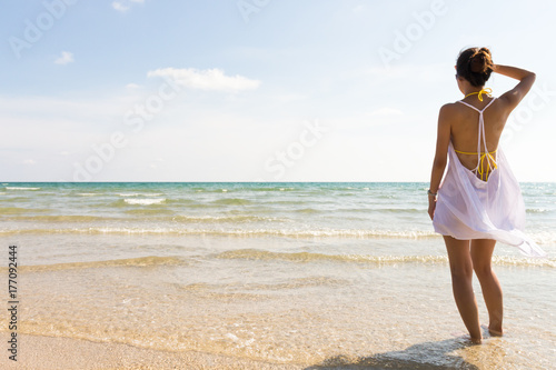 Young lady look towards the ocean in white dress at the beach. Summer vacation and travel concept. Traveling to tropical areas.