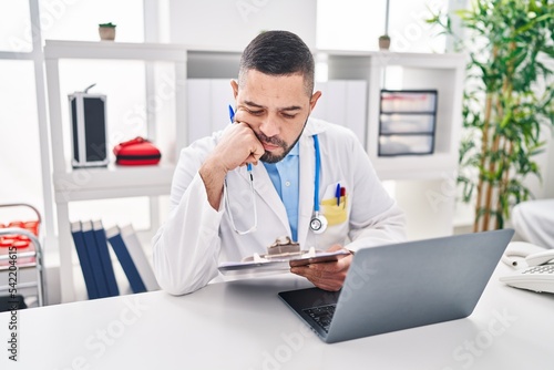 young, hispanic, man, male, adult, person, portrait, photogenic, beard, latin, serious, relaxed, condensed, concentration, looking, doctor, health care, medicals, medicine, work, working, professional, stethoscope, uniform, table, diagnosis, computer, laptop, visit, consultation, sitting, cyberspace, online, read, reading, document, report, paperwork, doubt, thinking, clinic, center, hospital, room, workplace, indoor, indoor, interior, background