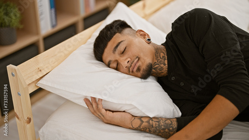 Young latin man lying on bed sleeping at bedroom