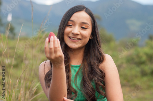 woman, strawberry, nature, healthy eating, smiling, fresh, latin, young, healthy lifestyle, fruit, natural, happy, holding, snack, beauty, red, green, field, mountain, landscape, summer, food, nourishment, wellness, diet, vitamin, organic, agriculture, farm, harvest, delicious, ripe, juicy, sweet, health, freshness, rural, countryside, girl, cheerful, enjoyment, vibrant, colours, lifestyle, well-being, plant, produce, season