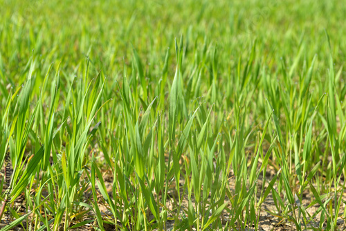 wheat, field, leaf, plant, grass, fresh, growing, green, new, cereal, cultivated, agriculture, closeup, farm, spring, food, environment, nature