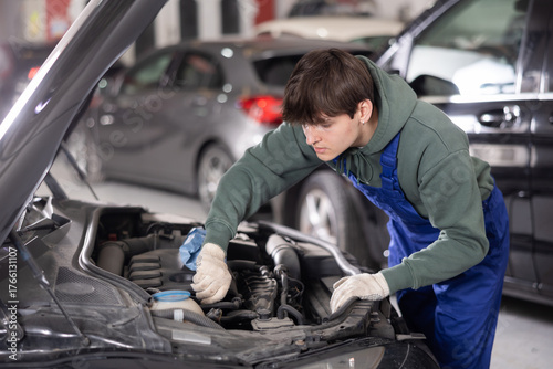 Young male auto mechanic in blue overalls and gloves focused on adjusting parts and tightening bolts under hood of vehicle in repair shop, with blurred background of other cars