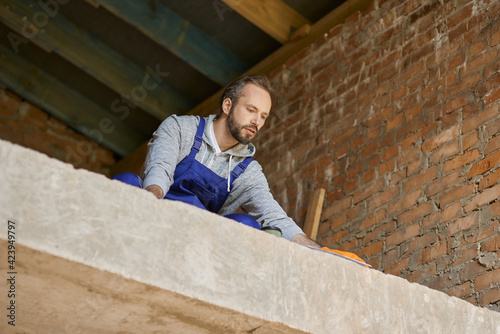 Young male builder in blue overalls looking enthusiastic while working on cottage house construction